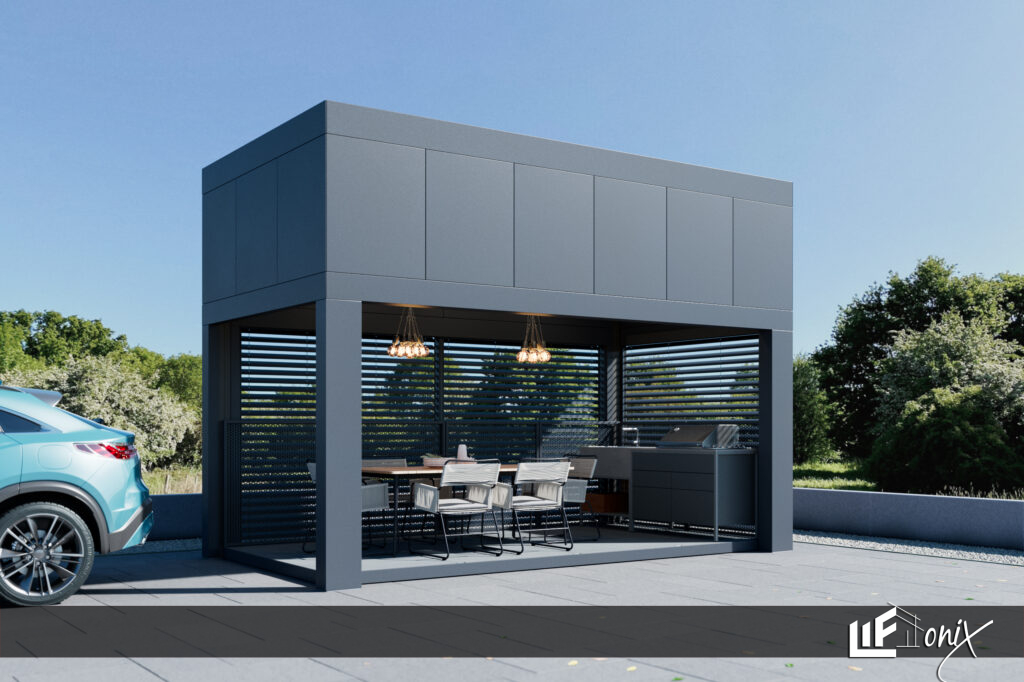 Inovativni nadstrešek za letni kotiček, ki združuje funkcionalnost in estetiko.