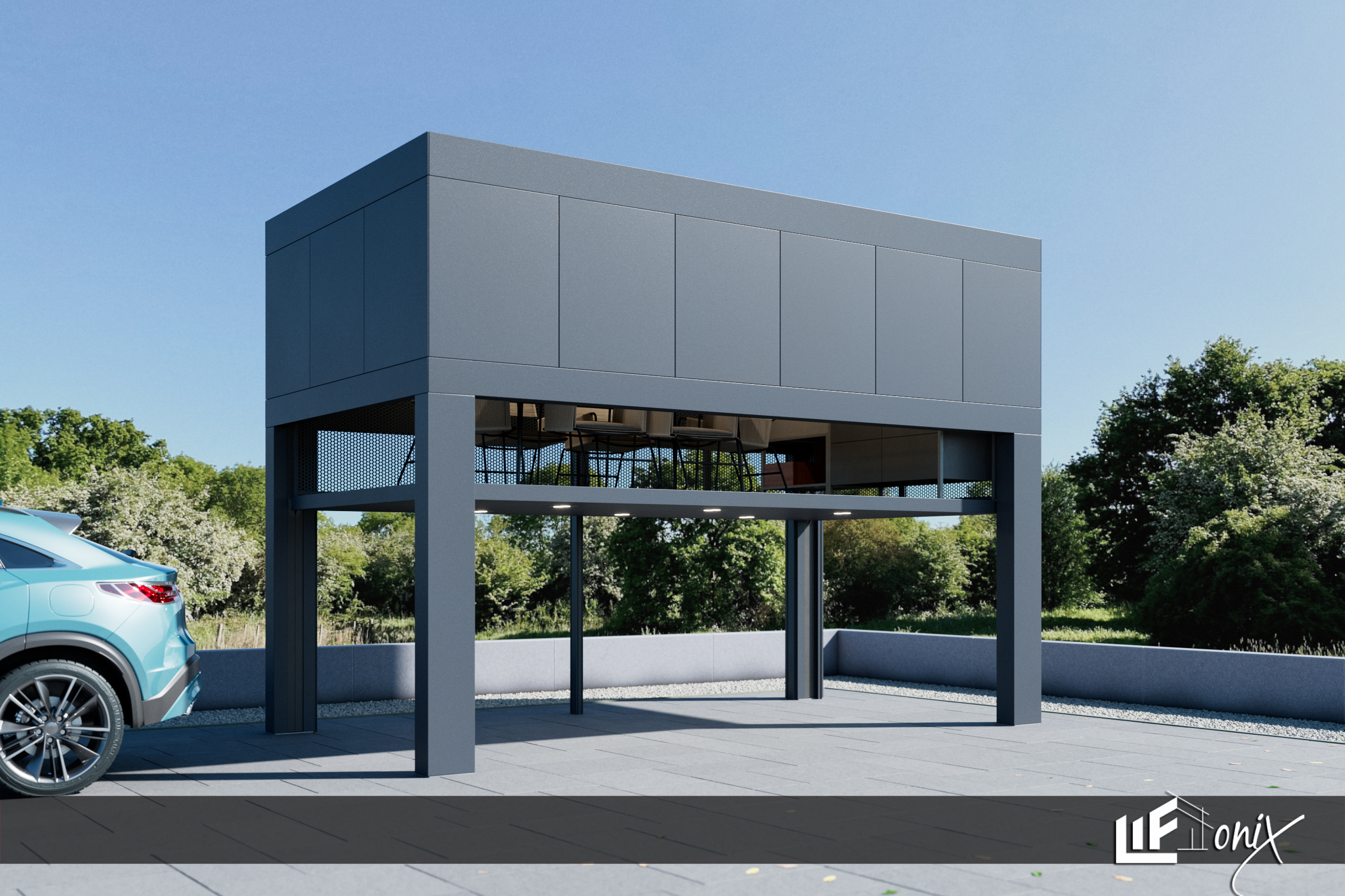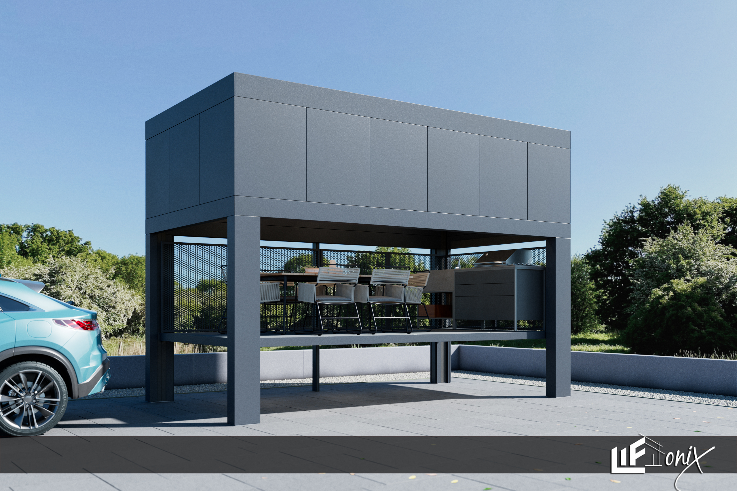 Inovativni nadstrešek za letni kotiček, ki združuje funkcionalnost in estetiko.