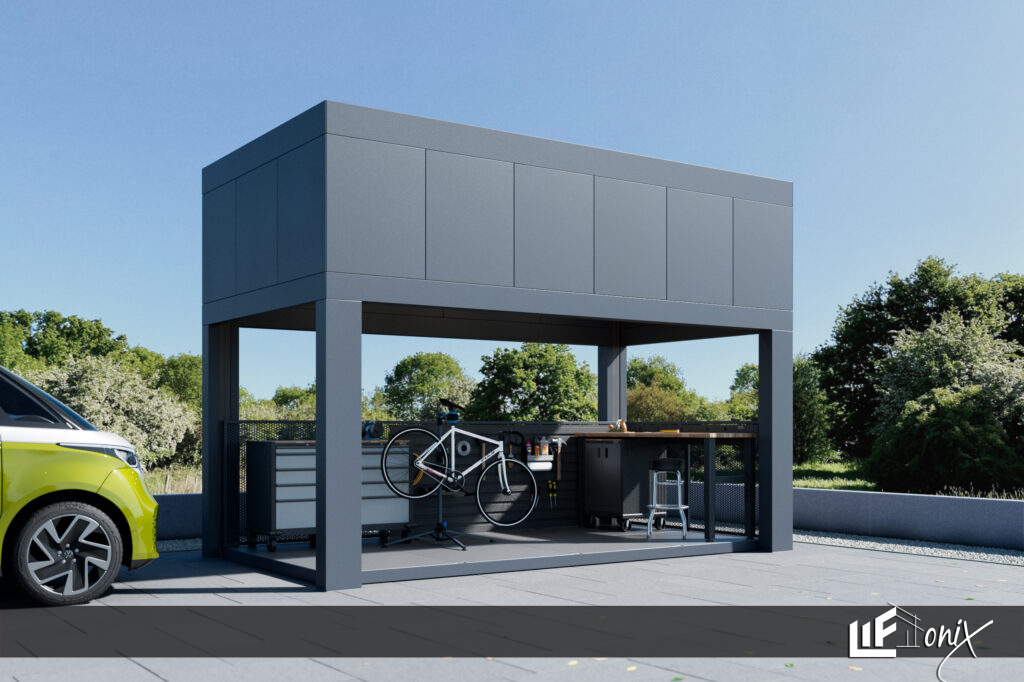 Inovativni nadstrešek z osebno delavnico nove generacije, kot pametna rešitev za urejenost, učinkovitost in kreativnost.