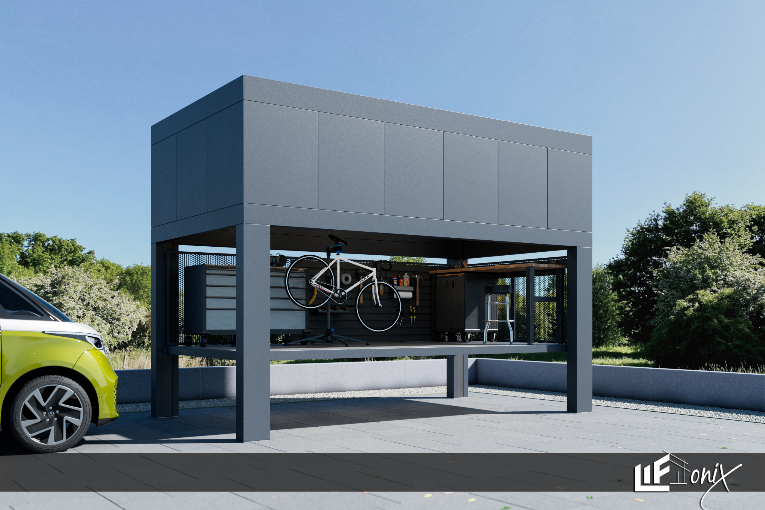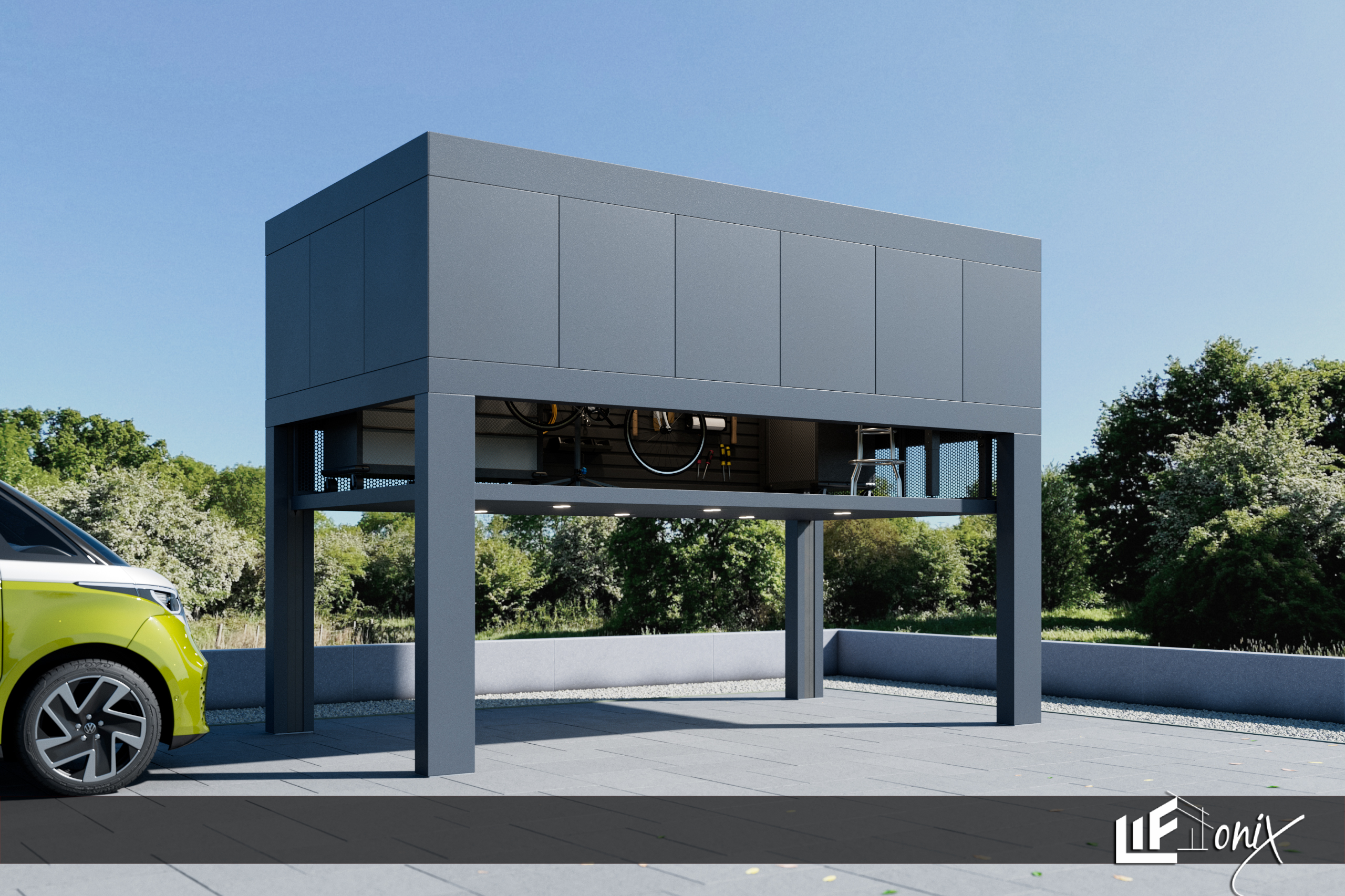Nadstrešek z integrirano dvižjo ploščadjo, ki elegantno in učinkovito preoblikuje prostor nad parkirnim mestom v pametno rešitev za ustvarjanje, popravila, tehnične projekte, urejen delovni prostor,….
