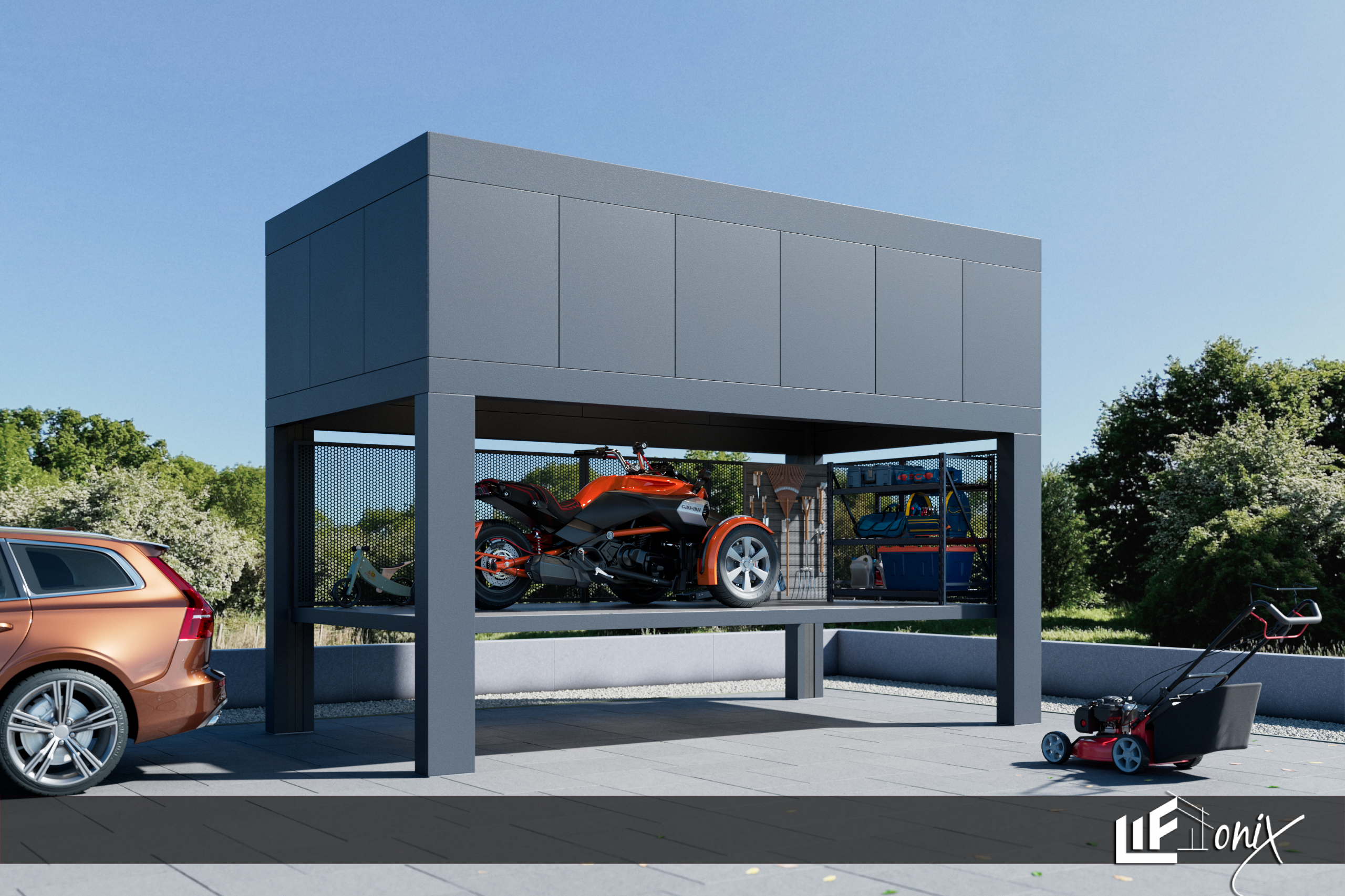 Z enim samim pritiskom na gumb ustvarite prostor za shranjevanje vrtne kosilnice, orodja, koles, motorja, zunanje garniture, pnevmatike in vsega, kar ne potrebujete vsak dan.